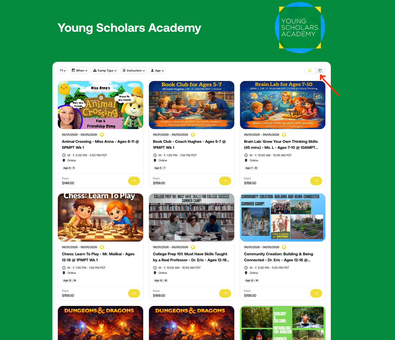 Click Calendar In Top Right For Calendar View. Camps Shown In Pacific Time